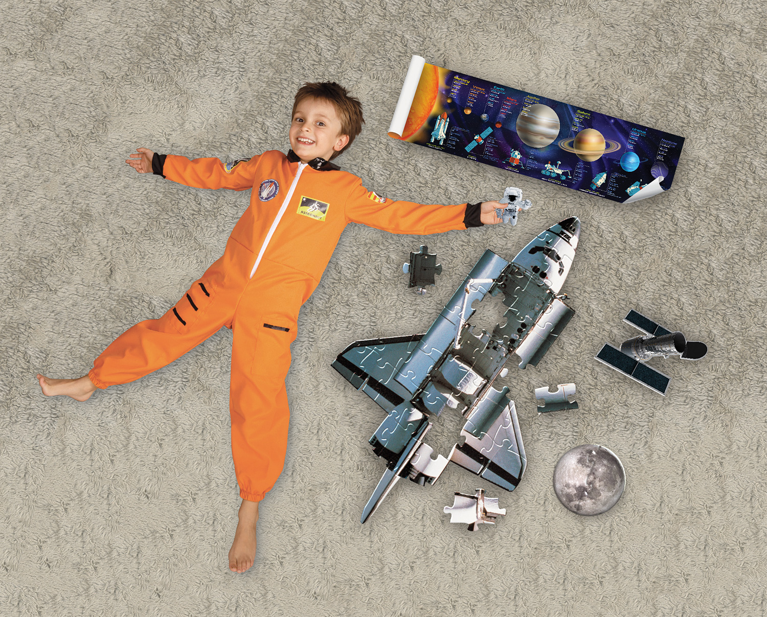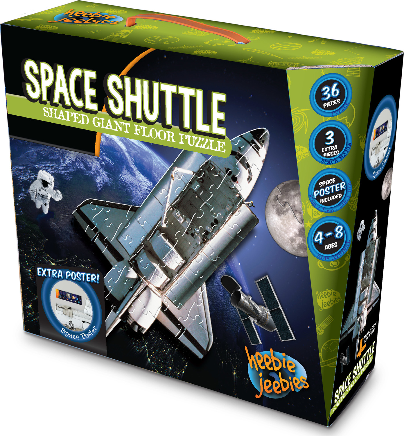 Kids can build this unique shaped floor puzzle of a space shuttle floating through space. Includes 3 extra pieces: Astronaut, The Hubble Telescope and Moon. 32cm x 31cm x 11.5cm